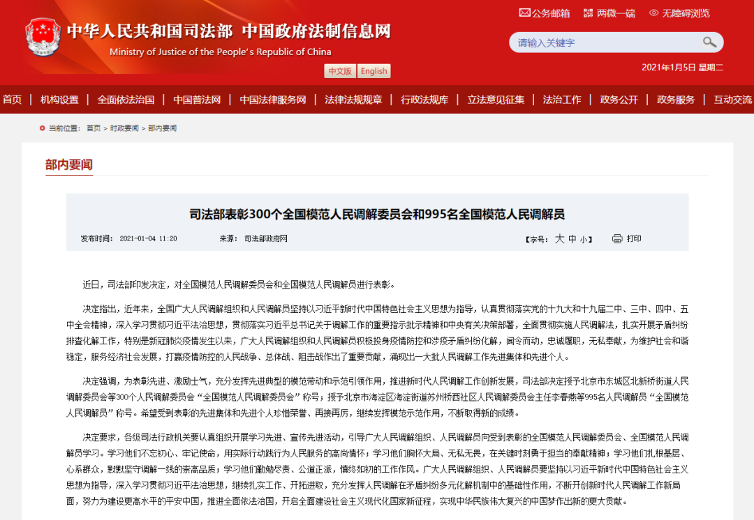我市1个人民调解委员会、4名人民调解员受到司法部表彰