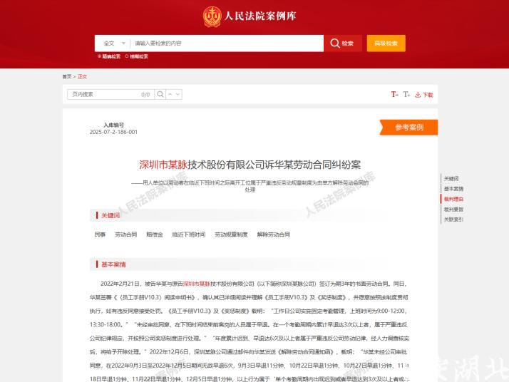 近日,最高人民法院正式公布首届“全国法院优秀案例”名单,东湖高新区法院“深圳某技术公司诉华某劳动合同纠纷案”(即“早退一分钟被辞退”案),从全国2782件参评案例中脱颖而出成功入选,成为了武汉市基层法院“唯二”全国法院优秀案例。