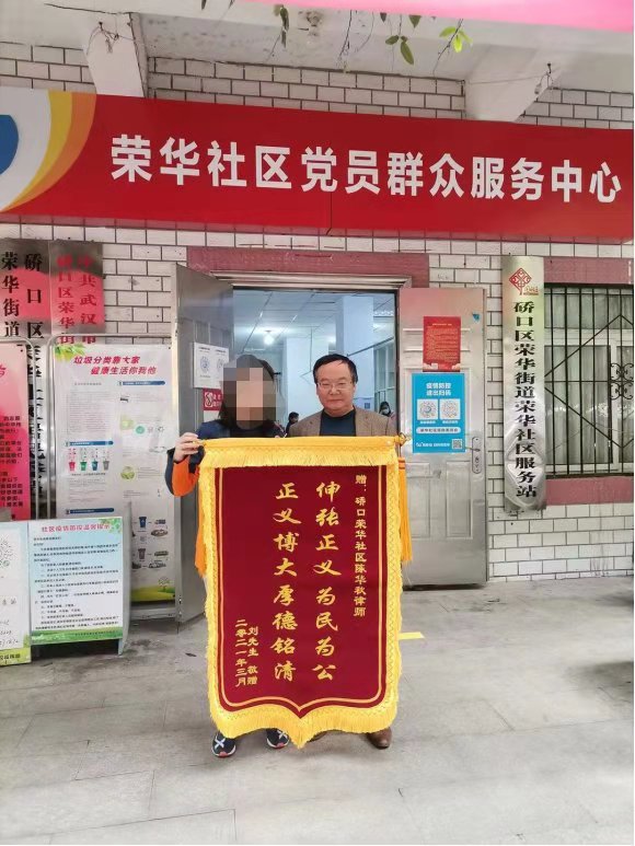 4月15日,保住工作的刘先生,委托妻子把一面锦旗送到社区居委会,以感谢陈华秋律师对自己的义务帮助。