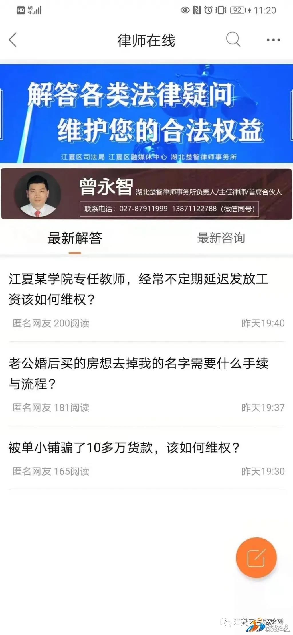 江夏区司法局依托江夏区融媒体中心“掌握江夏APP”近10万人次安装下载的受众量,在APP首页显著位置开辟《律师在线》网络公益普法宣传平台,由专业律师提供24小时免费在线法律咨询。