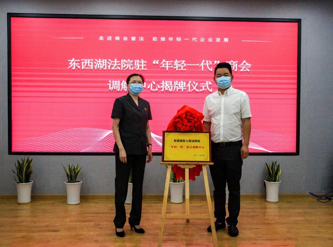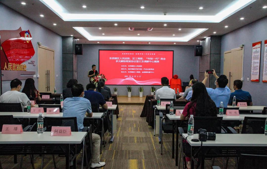 8月3日上午,在东西湖创业中心大楼,东西湖区法院、东西湖区工商联合会、区“年轻一代”商会共同签订多元解纷框架协议,同时区法院驻“年轻一代”商会(下称商会)调解中心揭牌成立。活动由东西湖区法院和东西湖区工商业联合会共同主办。区法院院长王道玮、区工商联合会书记窦华、区发改局(营商环境办)副局长赵先华、商会企业部分代表受邀参加了本次活动。