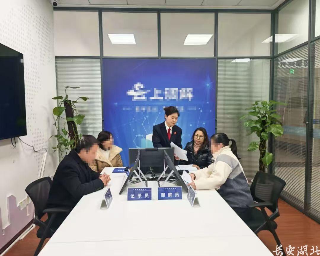 在硚口区法院“共享法庭”,入驻法官(左二)组织当事人开展线上调解