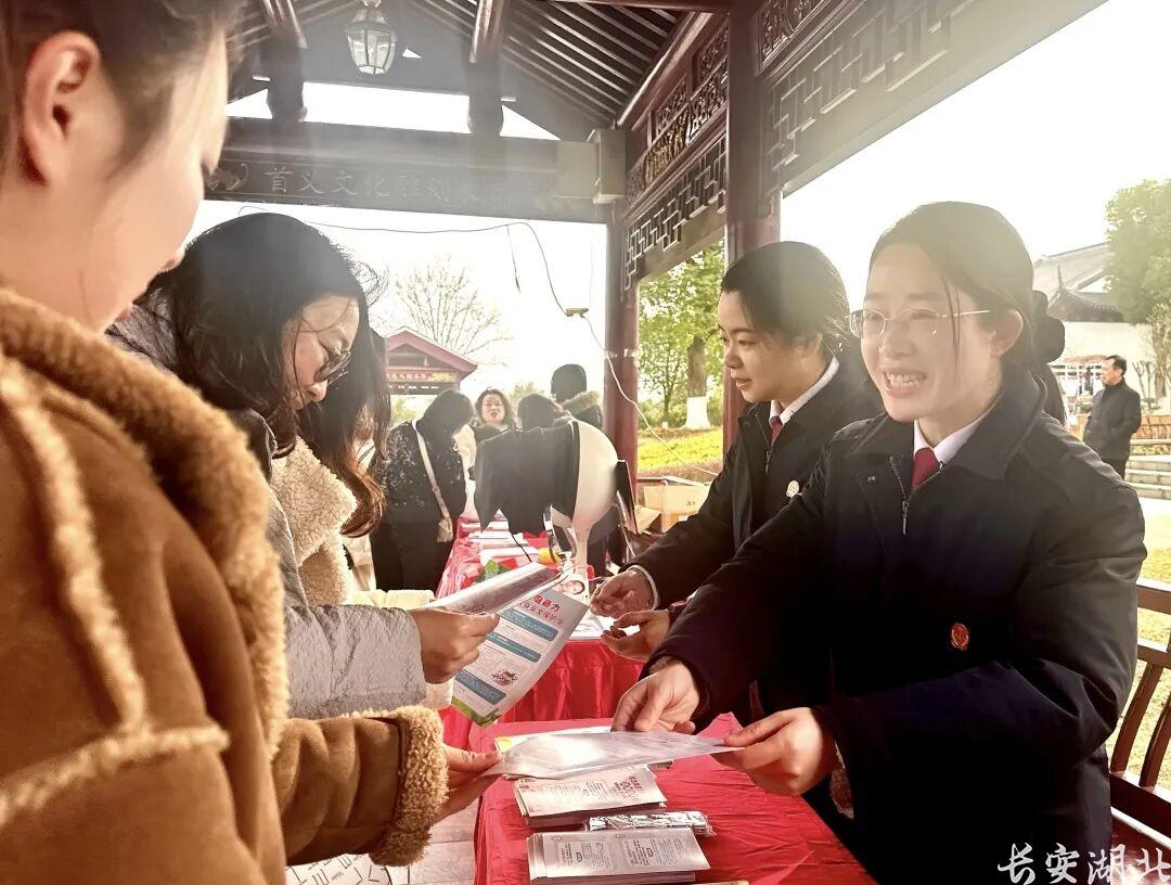 阳光轻柔地洒在木兰胜天农庄景区门口,近日,王家河人民法庭受邀参加王家河街道组织的“维护‘她’权益,绽放‘她’风采”三八妇女节维权宣传活动。法庭干警如春日的使者,迅速布置好普法宣传点。一时间,这里成为一道独特的风景线,吸引着众多游客和群众驻足。