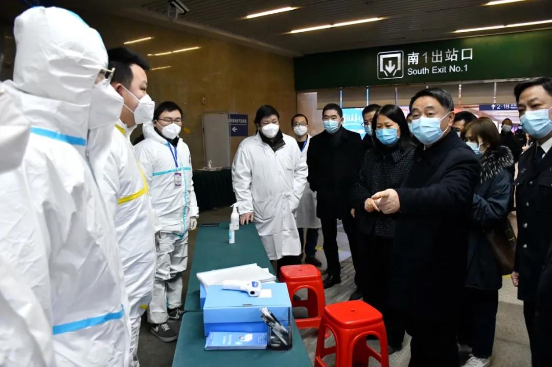 督导组首先到达汉口火车站南广场,检查交通枢纽及人员密集场所平安稳定工作,并在车站内境外人员返汉服务点了解疫情防控工作情况。督导组指出,在严密防范境外输入风险的同时,也要加强中高风险地区来汉返汉人员防控措施。