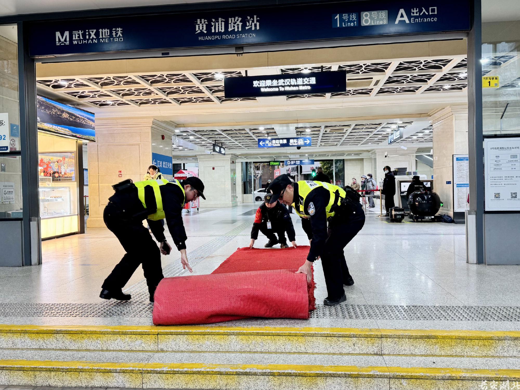 为有效应对低温天气,武汉轨道公安充分发挥“平安地铁联盟”作用,组织站务员、护卫等地铁各方力量对高架站顶棚、换乘通道、地铁出入口等重点部位开展隐患排查,及时发现处置各类安全隐患。在楼梯、进出站通道等重点部位安排专人值守,提前摆放各类防护设施,适时提醒过路乘客注意防滑、防摔。