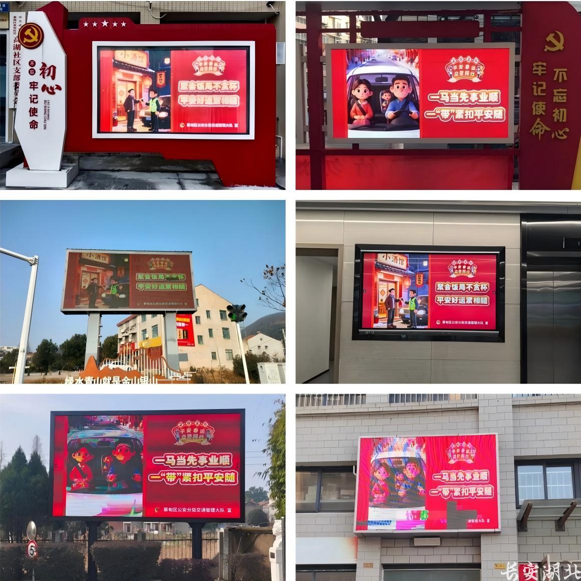 在严格路面管控的同时,武汉蔡甸交警坚持宣传先行,于春运首日同步启动全域交通安全“亮屏”宣传行动,走进学校、企业、商圈、党群服务中心等场所,通过电子显示屏全天候、高频次滚动播放春运交通安全标语、主题海报与公益视频,广泛传递平安出行理念。同时积极运用线上宣传渠道,依托社区、村湾及企业微信群,定向推送春运出行安全提示信息,实现精准宣传,共计覆盖群众达万余人。