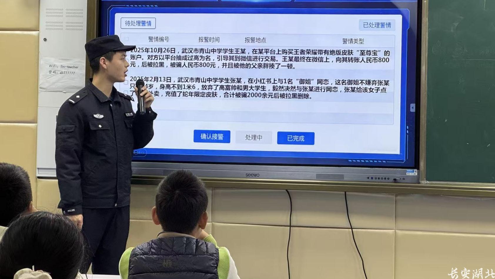 “如果游戏好友说低价卖你绝版皮肤,让你先转账再发货,你敢不敢转?”在青山中学,青山镇街派出所青年民警吴振、胡雅馨聚焦中小学生高发的游戏装备交易诈骗、明星周边转账诈骗,通过播放警示视频、剖析典型案例、现场演示拆解等方式,直观揭露诈骗套路。面对民警抛出的“骗术”,同学们纷纷摇头拒绝。