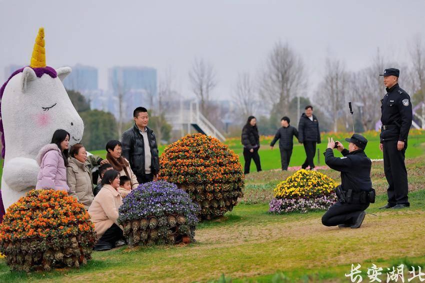 又是一年三月天,武汉市蔡甸区花博汇景区的万千繁花如期绽放。层层叠叠的花田铺就锦绣画卷,蜿蜒曲折的游览小径串联起处处靓景,游客从四面八方赶来,踏春赏景、打卡留影,共赴这场浪漫的春日之约。武汉市公安局蔡甸区分局大集街派出所民辅警穿梭于人潮之中,驻守在花田小径、打卡点位,让“警察蓝”与“花海色”交相辉映。