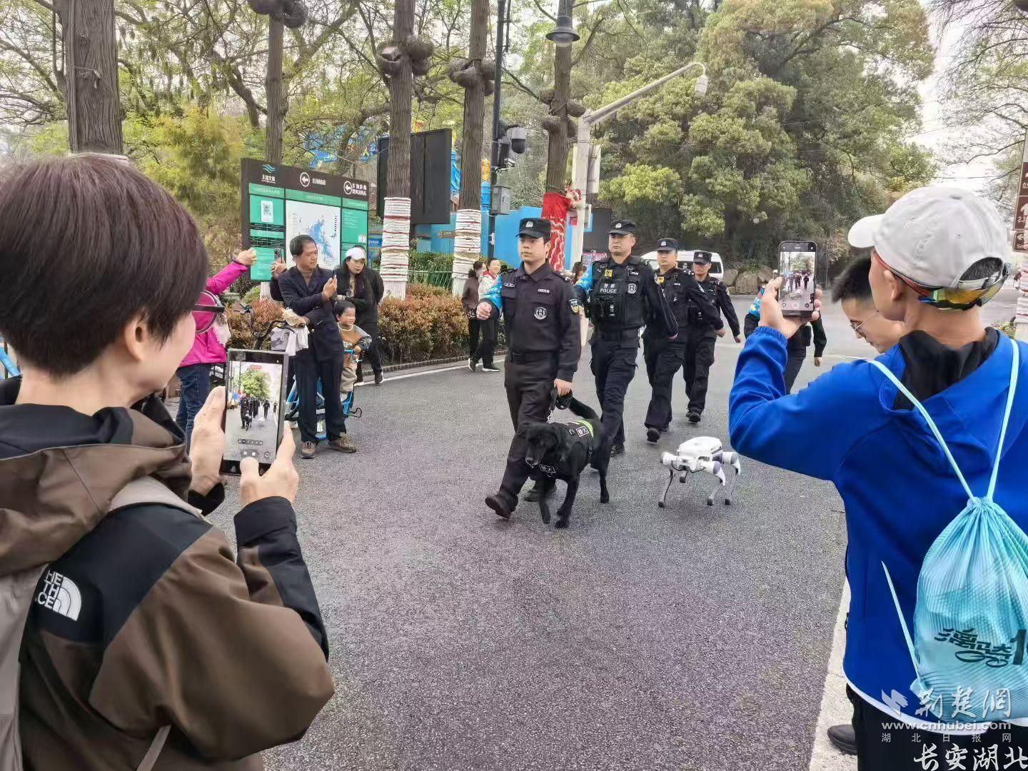 赏花季期间,“启生”每日都会佩戴好执勤装备,跟随张蕊沿东湖绿道、樱园核心区巡逻,配合民警完成现场防控工作。与“启生””一同值守的,还有刚完成大模型升级的警用机械犬。升级后,机械犬不仅能承担巡逻、应急处置等辅助工作,还能与游客实时语音对话,精准解答赏花路线、周边停车点位、便民服务点位置等各类咨询。