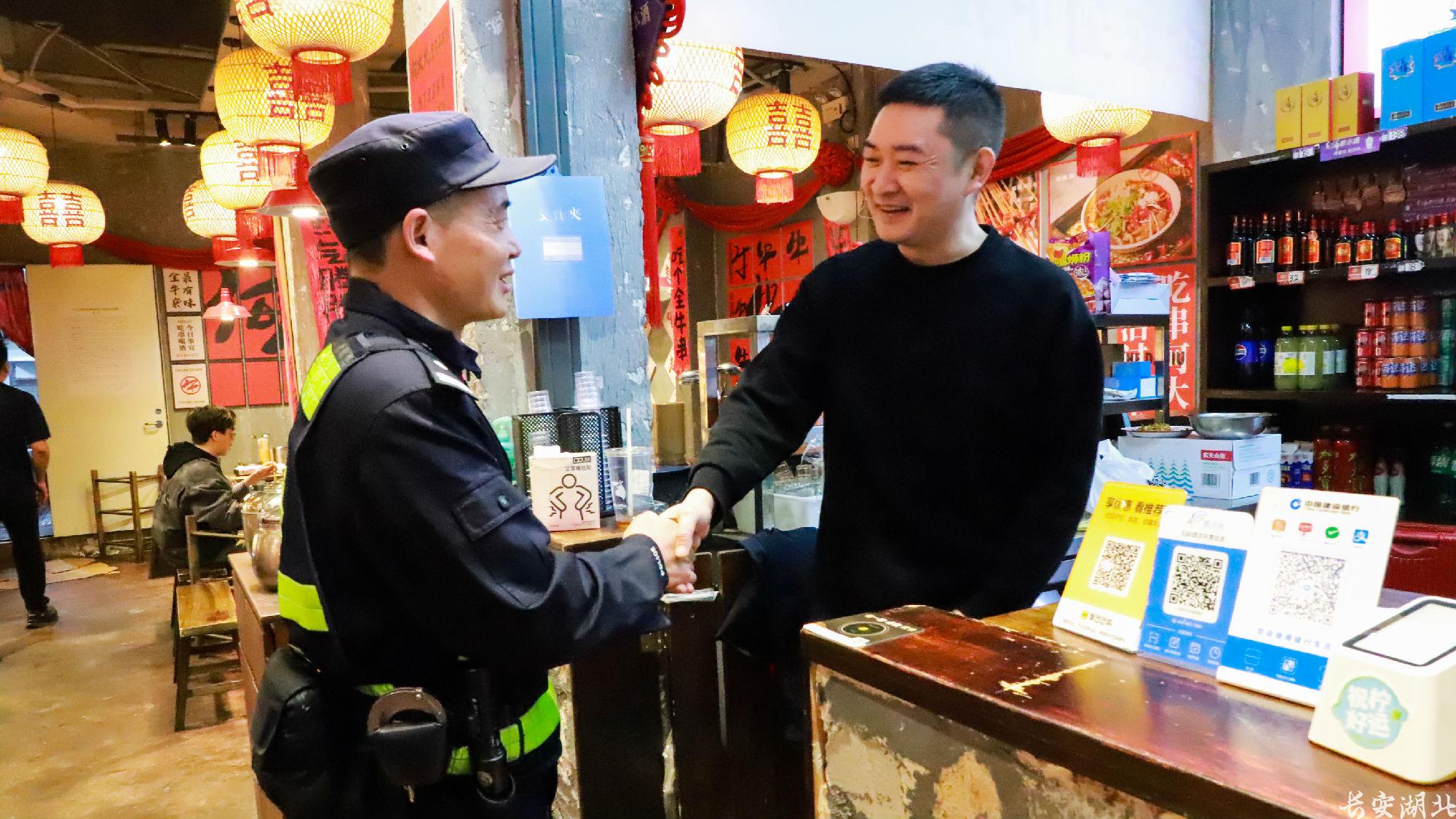 在恩施街巡逻,他有一个“标志性动作”——见到商户,总要主动上前握手、打声招呼。一个真诚的微笑,一句朴实的问候,一下子就拉近了警民之间的距离。