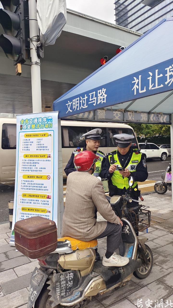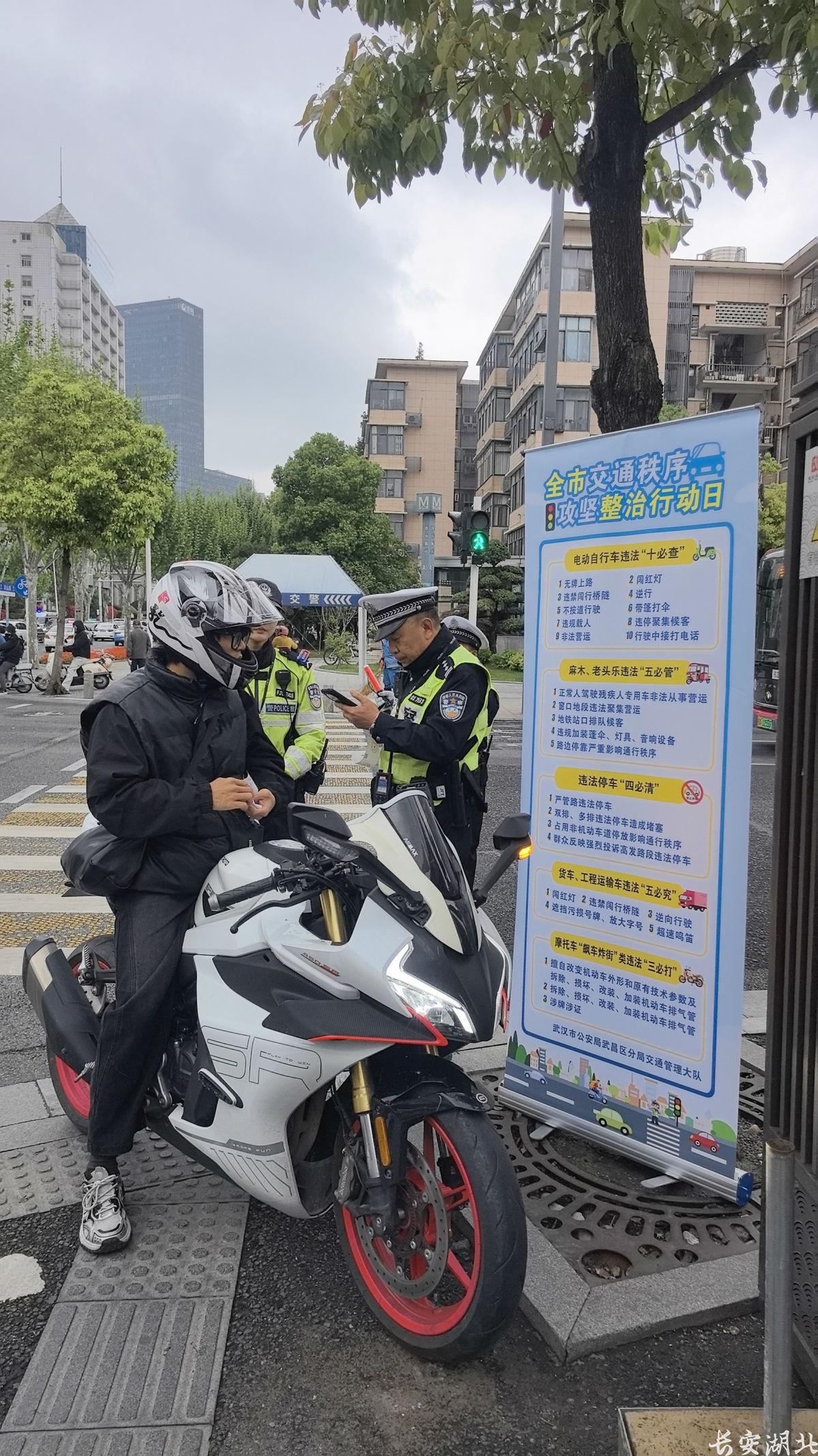 执法过程中,温情服务贯穿始终:洪山路东一路口,女快骑小分队化身“暖心风景线”,针对闯红灯、逆行、未佩戴安全头盔等违法行为耐心劝导,手把手指导安全头盔正确佩戴及上牌流程,以温和语气化解抵触情绪,让安全理念入脑入心。沙湖大桥下,民警拦停违规电动自行车后,细致讲解非机动车违禁上桥的安全风险;武车路口,采用“监控+路面视频教育”模式,对电动车驾驶员进行登记教育。