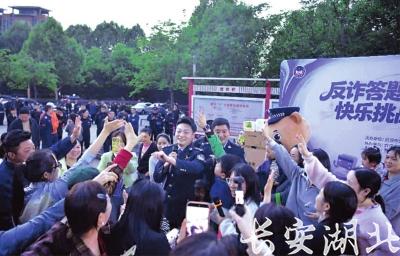 “各位邻居,答对反诈题,警察小熊、65寸电视抱回家!”24日晚6时30分,江岸区越秀星汇君泊二期商业广场人头攒动。暮色中,一块巨大的反诈展板前欢声阵阵,武汉市公安局江岸区分局将反诈宣传搬到居民家门口。